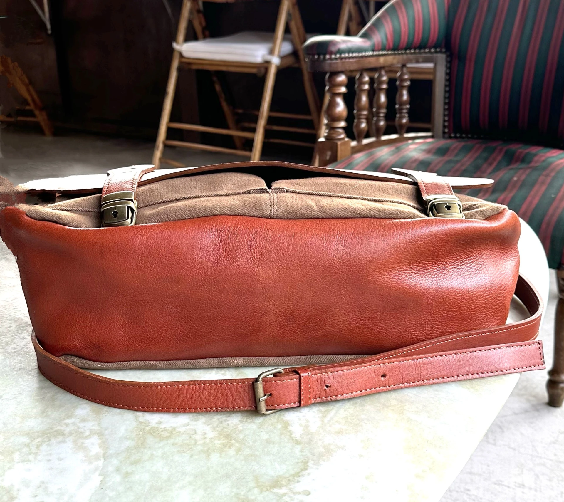 La longitud ajustable de las correas de los hombros garantiza que se adapta a cada tipo de cuerpo, brindando una comodidad personalizada que te acompañará durante tus jornadas. Su cierre rápido y seguro con broches de bronce te permite acceder a lo que necesitas en un instante, sin complicaciones.
